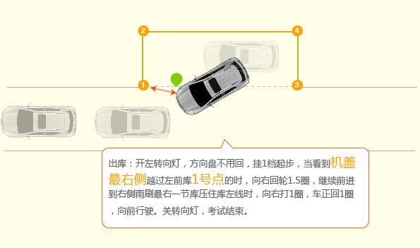 3、出库:开左转向灯,方向盘不用回,挂1档起步,当看到机盖最右侧越过左前库1号点的时后,向右回轮1.5圈,继续前进到右侧雨刷最右一节库压住库左线时,向右打1圈,车正回1圈,向前行驶。关转向灯,考试结束。