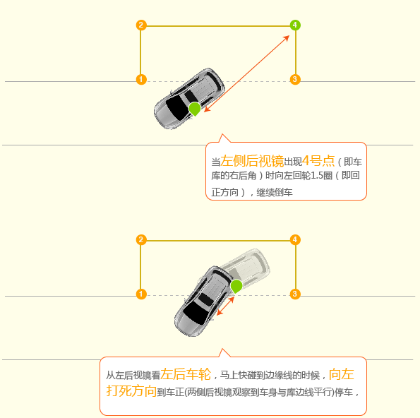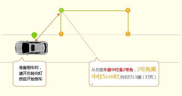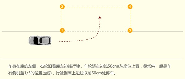 1、车身在库的左侧,右轮沿着库左边线行驶,车轮距左边线50CM(从作为上看,桑塔纳一般是车右侧机盖1/3的位置压线),行驶到库上边线以前50CM处停车。
