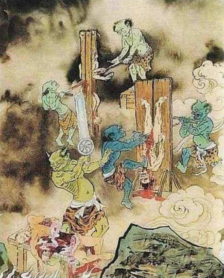 第十八层,刀锯地狱: 偷工减料,欺上瞒下,拐诱妇女儿童,买卖不公之人,死后将打入刀锯地狱。把来人衣服脱光,呈“大”字形捆绑于四根木桩之上,由裆部开始至头部,用锯锯毙。