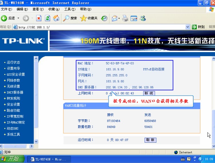 7、等重启以后,我们单击左侧的运行状态,如果看到下图中的相关参数以后就说明连接上网络了。