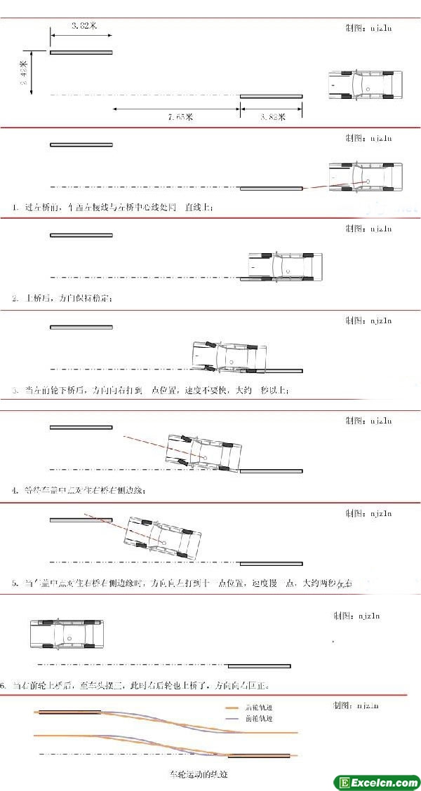 2、车子尽量早找到上左边桥位置,注意点:1、保证对准的时候车要正;2、对点,必要的时候最好头伸出去看前轮是否刚好可以上桥;
