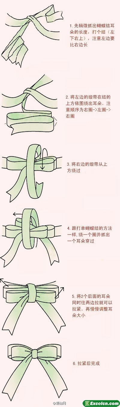 许多女孩子都喜欢蝴蝶结,特别是在小的时候总是希望自己的头饰、衣服上有蝴蝶结的样式,下面的双蝴蝶结的系法图解让你自己也可以用绳子编一个蝴蝶结,这属于一个双层蝴蝶结的样式啊。