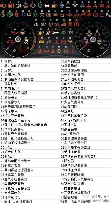 你经常开车吗,那么汽车上仪表盘上的符号你认识多少,你又知道有多少呢,根据调查有95%的驾驶员不能全部了解仪表盘上的灯是干什么的,只了解常见的仪表灯符号,下面为大家收集了常见的60多种汽车仪表图解。
