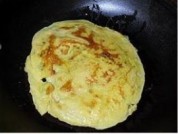 3、鸡蛋液在锅中煎成蛋饼,切成长条。