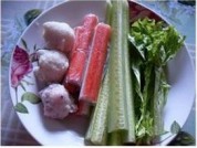 2、将黄瓜,生菜,鱼丸,鸡蛋饼切成宽一厘米的段,蟹足棒和鱼丸入沸水中煮熟。