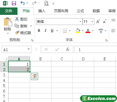 2、在A1和A2分别输入1、2这两个数字,或者是101、102这两个数字,如图1所示。