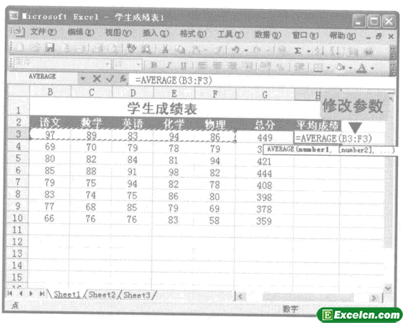 3、由于这里的函数参数中多了“总分”列,因此需直接选择B3:F3单元格区域作为函数参数进行计算。