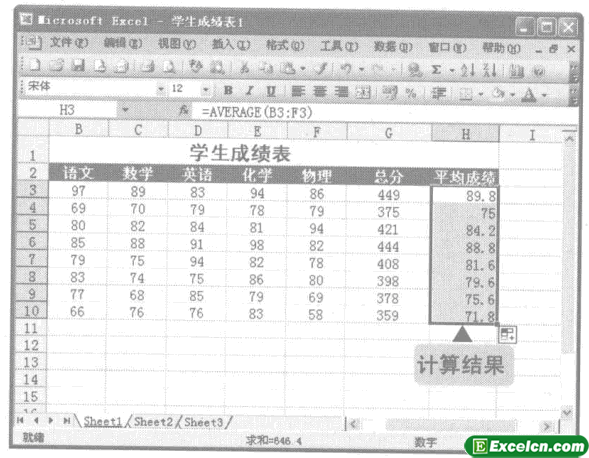 4、按快捷键【Ctrl+Enter】计算出“代明”的平均成绩,然后将H3单元格中的公式复制到H4:H10单元格区域中,计算出其他学生的平均成绩。