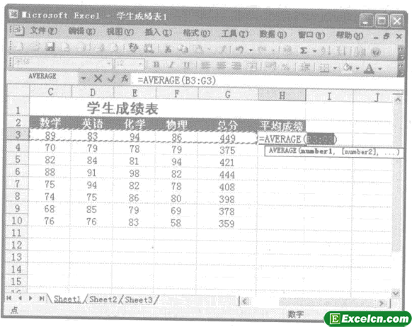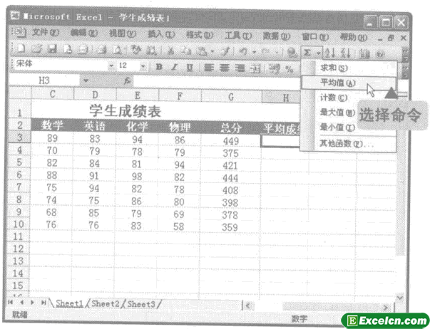 1、打开“学生成绩表1”工作簿,选择H3单元格单击“常用”工具栏中的函数按钮右侧的下箭头按钮,在弹出的下拉列表中选择“平均值”选项。