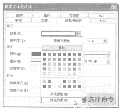 2、弹出“设置文本框格式”对话框,切换到“颜色与线条”选项卡,在“填充”选项组中的“颜色”下拉列表框中选择“填充效果”命令。