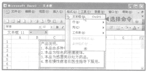 1、在excel工作表中选择创建的文本框,然后选择“格式”-“文本框”命令或双击该文本框。