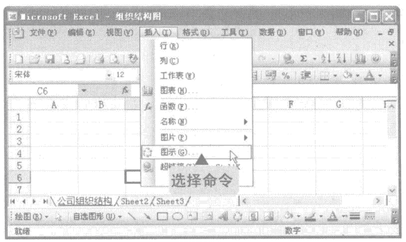 1、新建一个工作簿并将其保存为“组织结构图”,将“Sheet1”工作表重命名为“公司组织结构”,然后选择“插入”-“图示”命令。