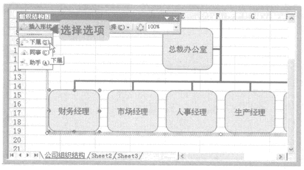 11、选择“财务经理”分支,单击“组织结构图”工具栏中的“插入形状”按钮右侧的按钮,在弹出的下拉菜单中选择“下属”选项。