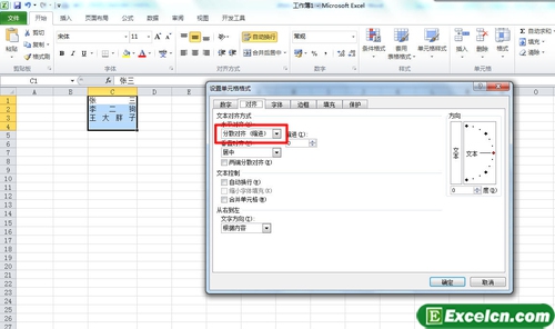 2、然后我们找到开始标签下的对齐项,单击右下角的箭头,在打开的设置单元格格式对话框中我们选择水平对齐方式下拉菜单中的分散对齐,然后我们就可以看到所有的姓名就都对齐了。