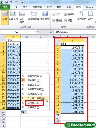 2、我们在excel2010中可以分别填充年、月或者是日,我们像一般的自动填充一样把单元格向下拉,然后在自动填充选项中我们选择以月、日、天数等填充方法。