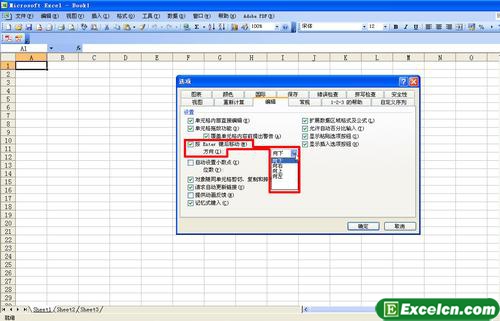 2、在编辑标签下面有一个“按‘ENTER’键后移动方向”的选项列表,我们在这个选项中选择一个方向然后确定就可以了。