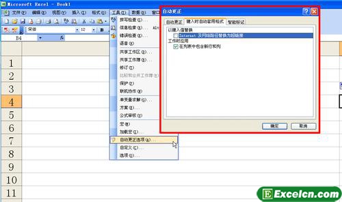 1、首先我们在excel工具菜单中找到自动更正选项,然后在弹出的自动更正对话框中,我们找到第二个标签键入时自动套用格式中。