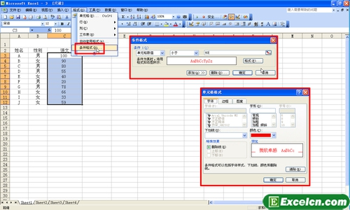 2、然后我们在excel格式菜单下选择条件格式,在打开的条件格式对话框中,我们在第一排的的哥栏中选择小于,在右侧输入60,然后再单击格式按钮,在格式对话框中把字体颜色改为红色,最后满足条件的excel单元格就变成红色了。