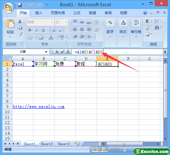 1、首先我们要知道excel中的连接符是什么,excel连接符就是“&”,如果我们要合并到E1单元格中,我们只需要在E1单元格中输入公式:=A1&B1&C1&D1。