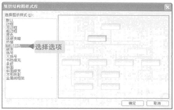 2、弹出“组织结构图样式库”对话框。在“选择图示样式”列表框中选择“三维颜色”选项,单击“确定”按钮。