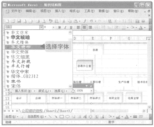 6、选择图示,在“格式”工具栏中的“字体”下拉列表框中选择“华文隶书”选项,为图示中的文字设置字体格式。