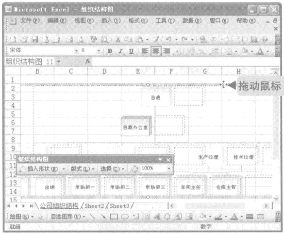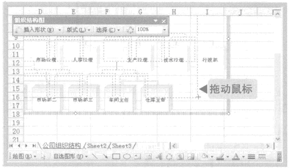 4、选择图示,将鼠标光标移到组织结构图右下角的控制点上,当其变为箭头形状时,按住鼠标左键不放,向内拖动,使图示缩小。