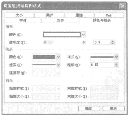10、将鼠标移动到图示的边框上,并双击,弹出“设置组织结构图格式”对话框,切换到“颜色与线条”选项卡,在“填充”选项组中设置颜色为“白色”,在“线条”选项组中设置颜色为“红色”,样式为‘6磅”的线条样式,完成后单击“确定”按钮。
