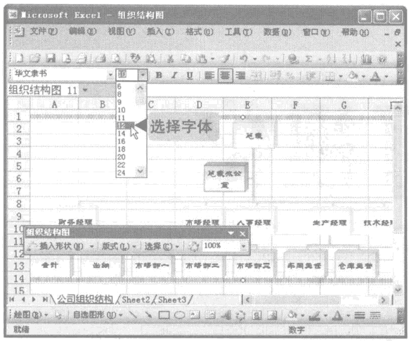7、保持图示的选择状态,在‘格式”工具栏中的“字号”下拉列表框中选择“12”选项,为图示中的文字设置字号。