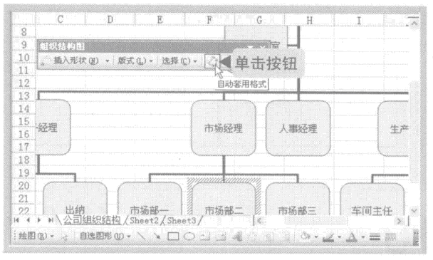 1、选择工作表中制作的组织结构图图示,然后单击“组织结构图”工具栏中的“自动套用格式”按钮。