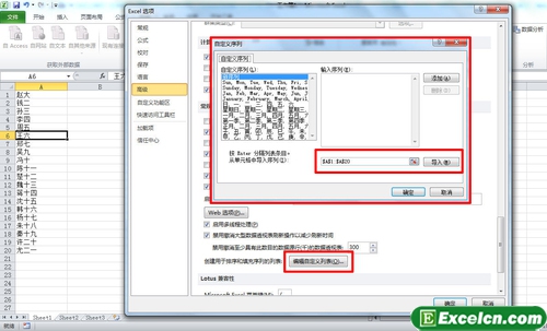 1、我们首先将所有的姓名选中,然后在excel工具菜单中选择选项命令,在excel选项对话框中找到高级项,在其中的常规项下点击“编辑自定义列表”,打开自定义列表对话框,按导入按钮,在导入按钮左侧可以看到刚刚选择的职工姓名单元格的区域,确定之后回到选项对话框,再次确定之后就可以了。