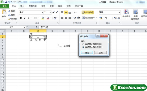 2、选择好粘贴的位置以后,我们按下excel快捷键【CTRL+SHIFT++】,这时候在插入对话框中选择周围单元格是向下移动还是向右移动,然后单击确定。