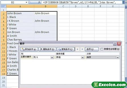 不论哪个Excel版本都可以使用。假设A列输入的是姓名(从A2单元格开始),则在B2中输入:=IF(ISERROR(SEARCH(“Brown”,A2,1))=FALSE, “John Brown”,””)。 将此公式向B列下方拖拽复制;点击A3或表内的任何单元格,然后选择“数据”菜单中的“排序”,然后选择 “列B”、“数值”、“降序”。这样就能在B列列出所有的John Brown,然后按顺序将与其相关的行集合到一起。