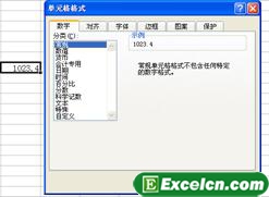 2、Excel内置的数字格式多种多样,能够满足用户在一般情况下的需要。下面用几个例子来说明同样的数字被设置为不同的数字格式后,显示效果会有哪些改变。假设一个单元格中有数字1023.4,在默认情况下,Excel不对单元格设置任何数字格式,此时的格式名称为“常规”,数值按照它的真实面貌显示出来。用户在“单元格格式”对话框的“数字”选项卡中可以看到一个“示例”项目,它可以在用户单击“确定”按钮以前就显示当前单元格的数值在应用了指定的数字格式以后的样式,如图2所示。