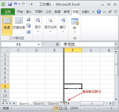 我们将鼠标移动到垂直或者水平滚动条的标记上,当变成其他的鼠标样式的时候我们进行上下或者左右移动即可拆分单元格了,如图2所示。