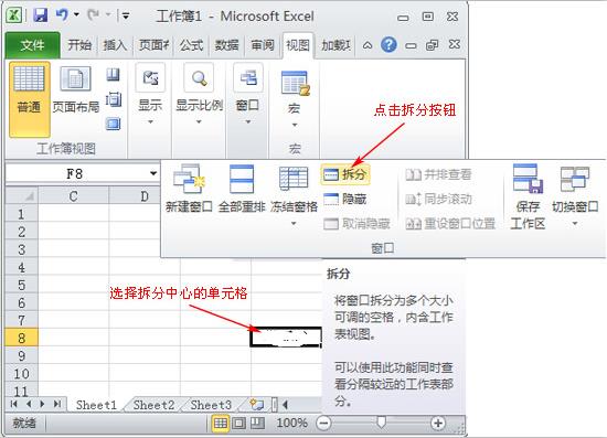 excel中可以拆分成2个或者4个独立的单元格,在每一个独立的单元格中查看不同的单元格位置。